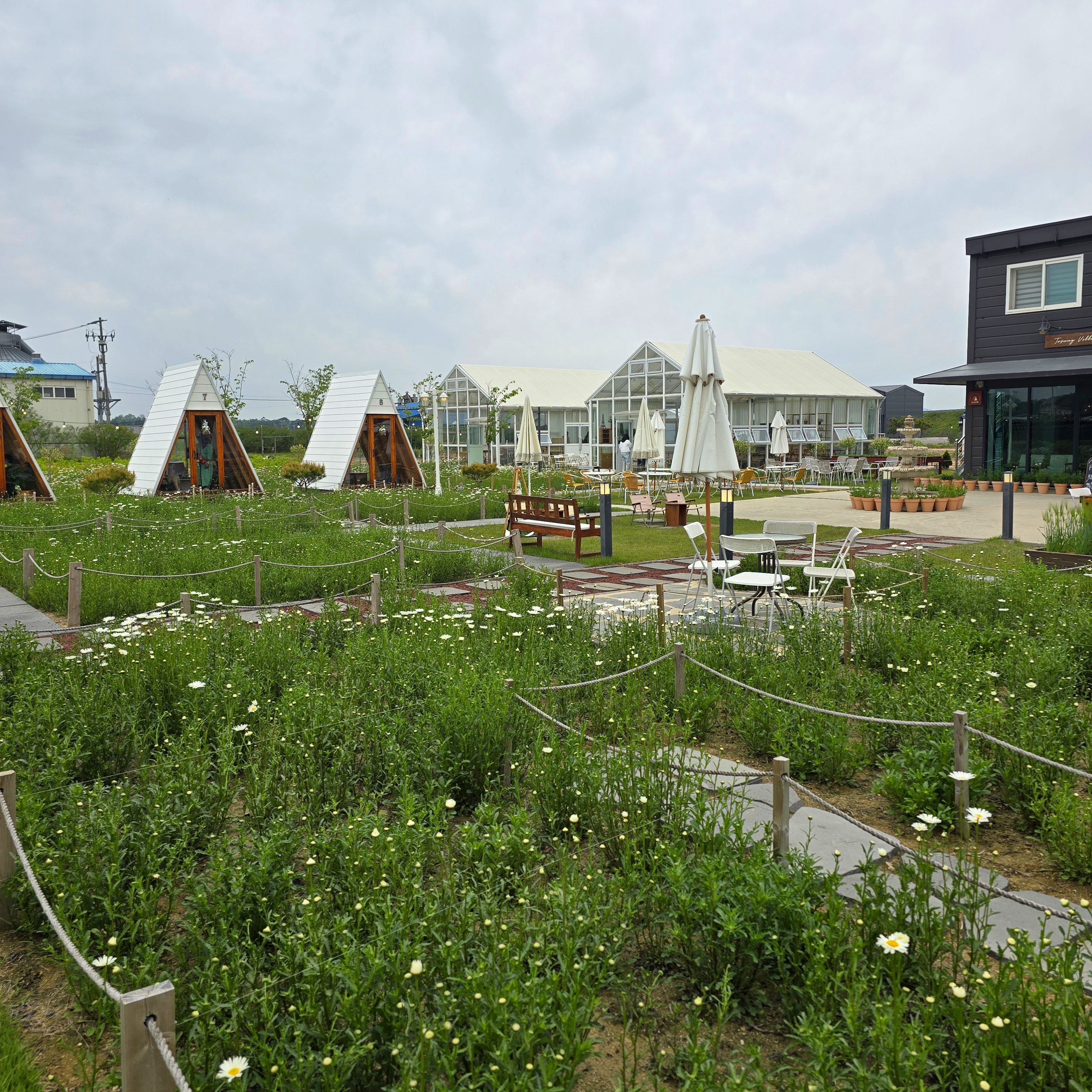 카페 정원에는 하얀 데이지 꽃들이 만발하게 피어 있었고, 그 사이로 독특한 삼각형 모양의 오두막들이 나란히 자리하고 있었습니다. 꽃길 사이로 난 돌길을 따라 걷다 보면, 마치 동화 속 세계에 들어온 듯한 느낌이 들었습니다. 초록 잔디와 하얀 데이지의 조화가 너무나 평화로웠습니다.