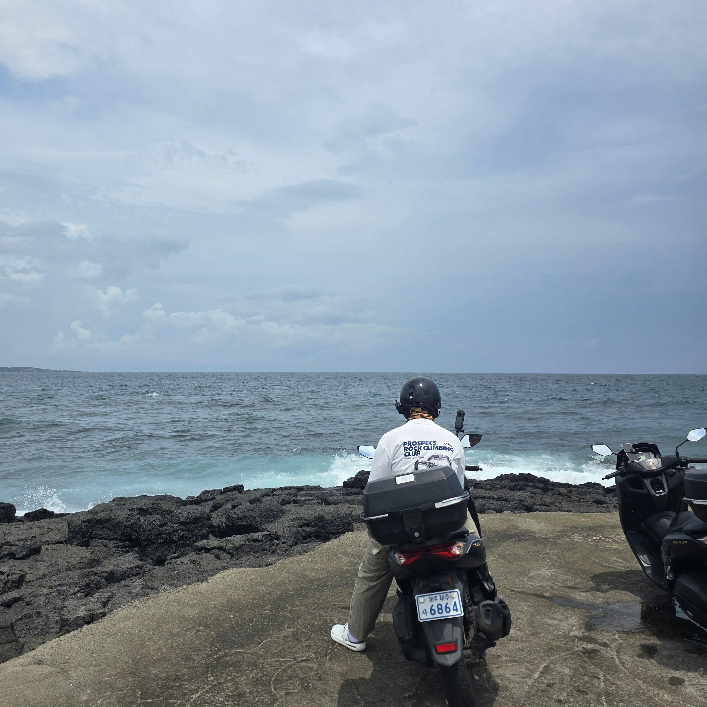 이번 여행은 렌트한 N-MAX 스쿠터로 진행했는데, 좌석과 적재함이 넉넉해서 장거리 주행도 편했어요. 방파제 앞에서 잠깐 쉬는 동안 바다 바람이 불어오고, 헬멧 안으로 들어오는 소금기 섞인 공기가 기분 좋게 다가왔죠. 특히 서귀포 해안도로는 차보다 스쿠터로 달릴 때 훨씬 더 풍경이 잘 보이고 바다 냄새도 그대로 느낄 수 있어요.